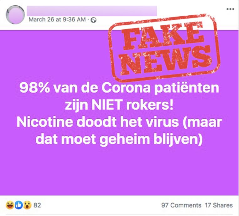 Er gingen verschillende geruchten de ronde dat nicotine het redmiddel was tegen het virus. Natuurlijk is dit ook nep. Toch gaan er geruchten rond dat "98% van de Corona patiënten zijn niet rokers! Nicotine doodt het virus". Het tegendeel is waar: rokers lopen net een grotere kans op besmetting dan niet rokers.